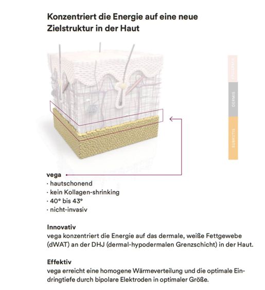 Im Vergleich zu herkömmlichen Radiofrequenz-Behandlungen zielt die nicht invasive vega-Methode auf eine neue Zielstruktur ab: die dermalen Adipozyten in der Grenzschicht zwischen Dermis und Subkutis – auch Dermal Hypodermal Junction (DHJ) genannt. Sie steht aktuell im Fokus der dermokosmetischen und ästhetischen Medizinforschung. Denn die DHJ hat einen entscheidenden Einfluss auf das Volumen der Haut, ihre Elastizität, Festigkeit und Struktur.